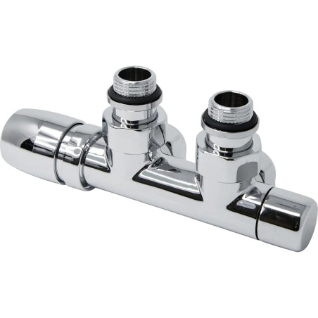 Towel radiator set with a pair of manually-operated, thermostatically-controllable angle valves for copper pipes.