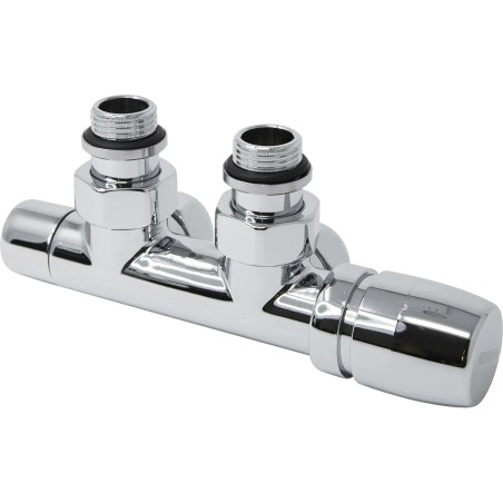 Ensemble pour radiateur sèche-serviettes avec une paire de robinet équerre aller-retour, thermostatisable à commande manuelle, pour tubes cuivres.