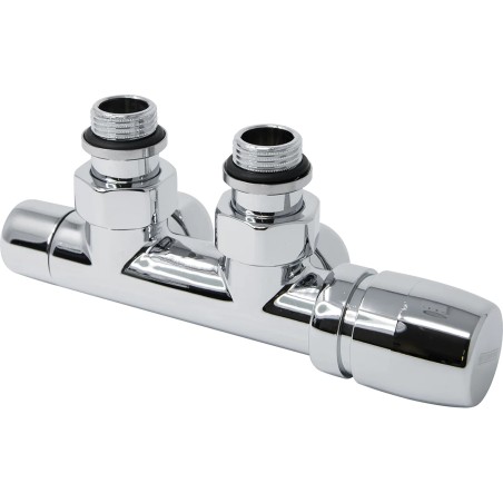 Ensemble pour radiateur sèche-serviettes avec une paire de robinet équerre aller-retour, thermostatisable à commande manuelle, pour tubes multicouches.